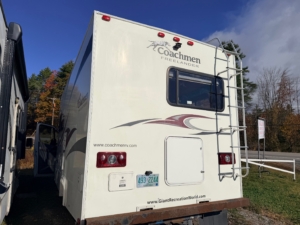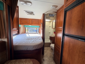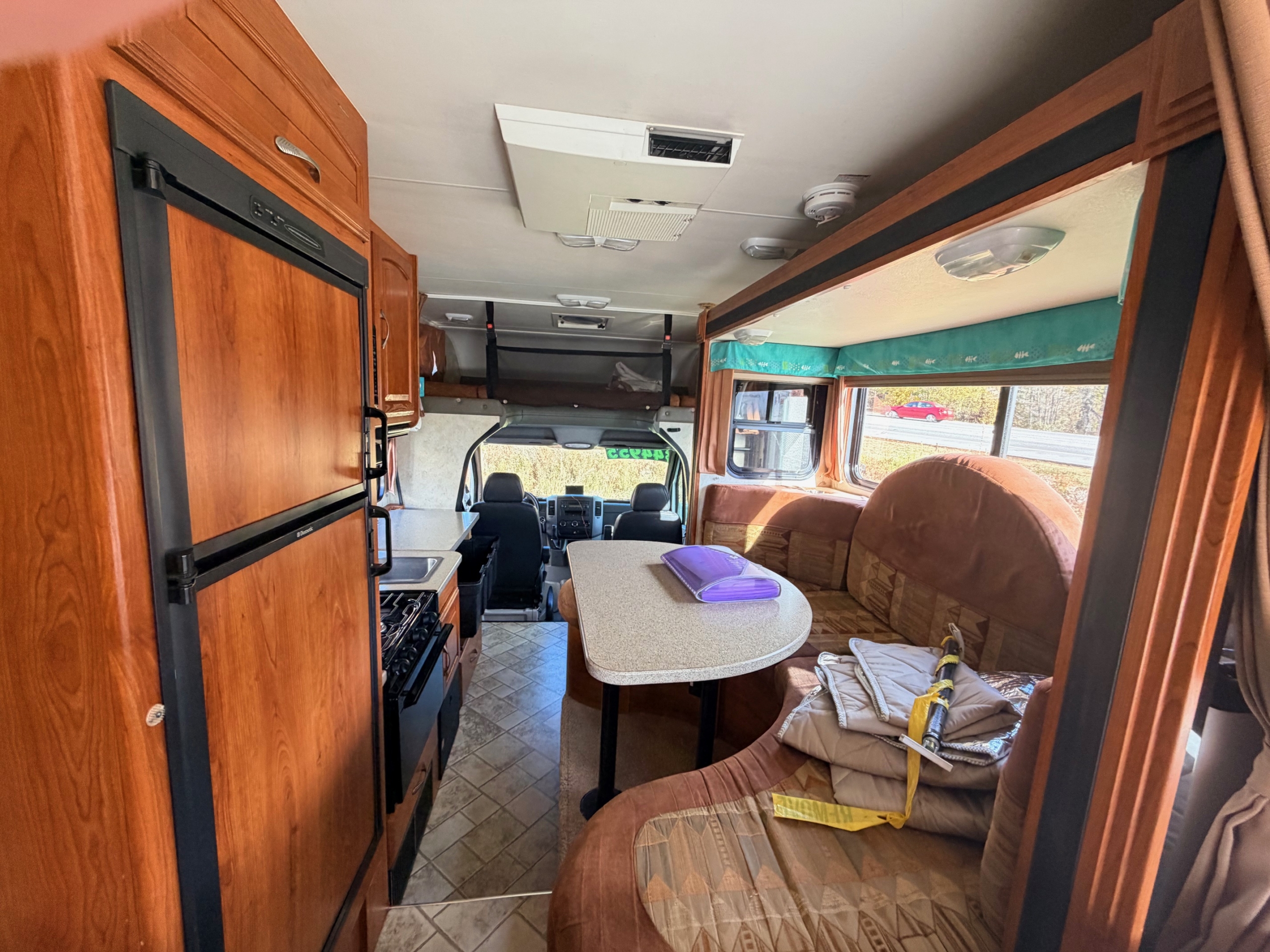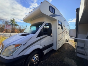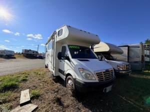 The 2010 Coachmen 2100CB (which is likely the M-2100CB Sprinter or similar model) has only 54,684K Miles, and is a Class C diesel motorhome with a length of approximately 25 feet. Key specifications include sleeping for 6, a dry weight of 9,370 lbs, a GVWR of 11,030 lbs, and a 50-gallon fresh water capacity. It features a queen bed floor plan and is self-contained.