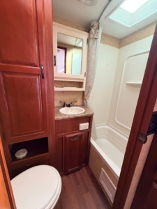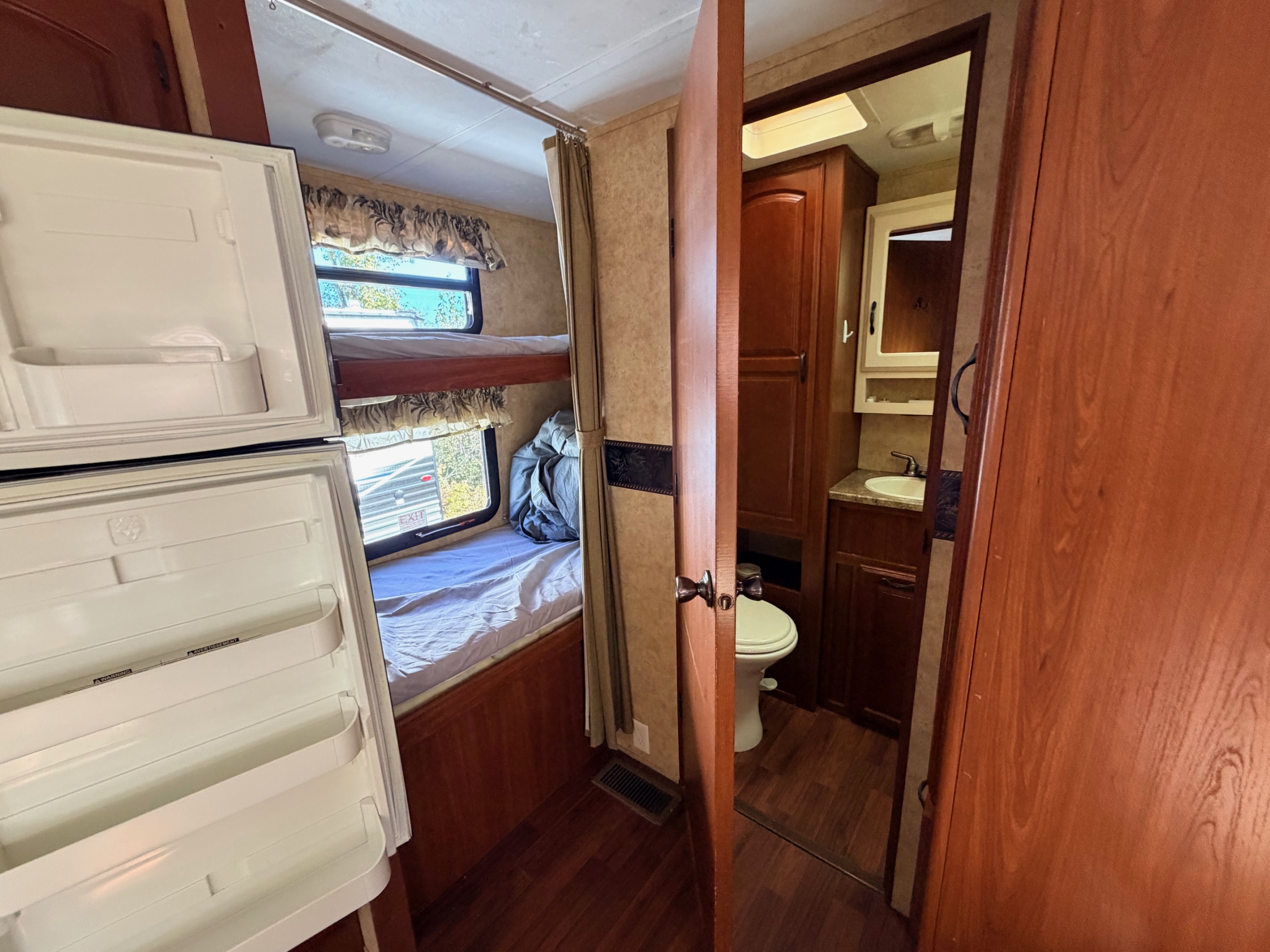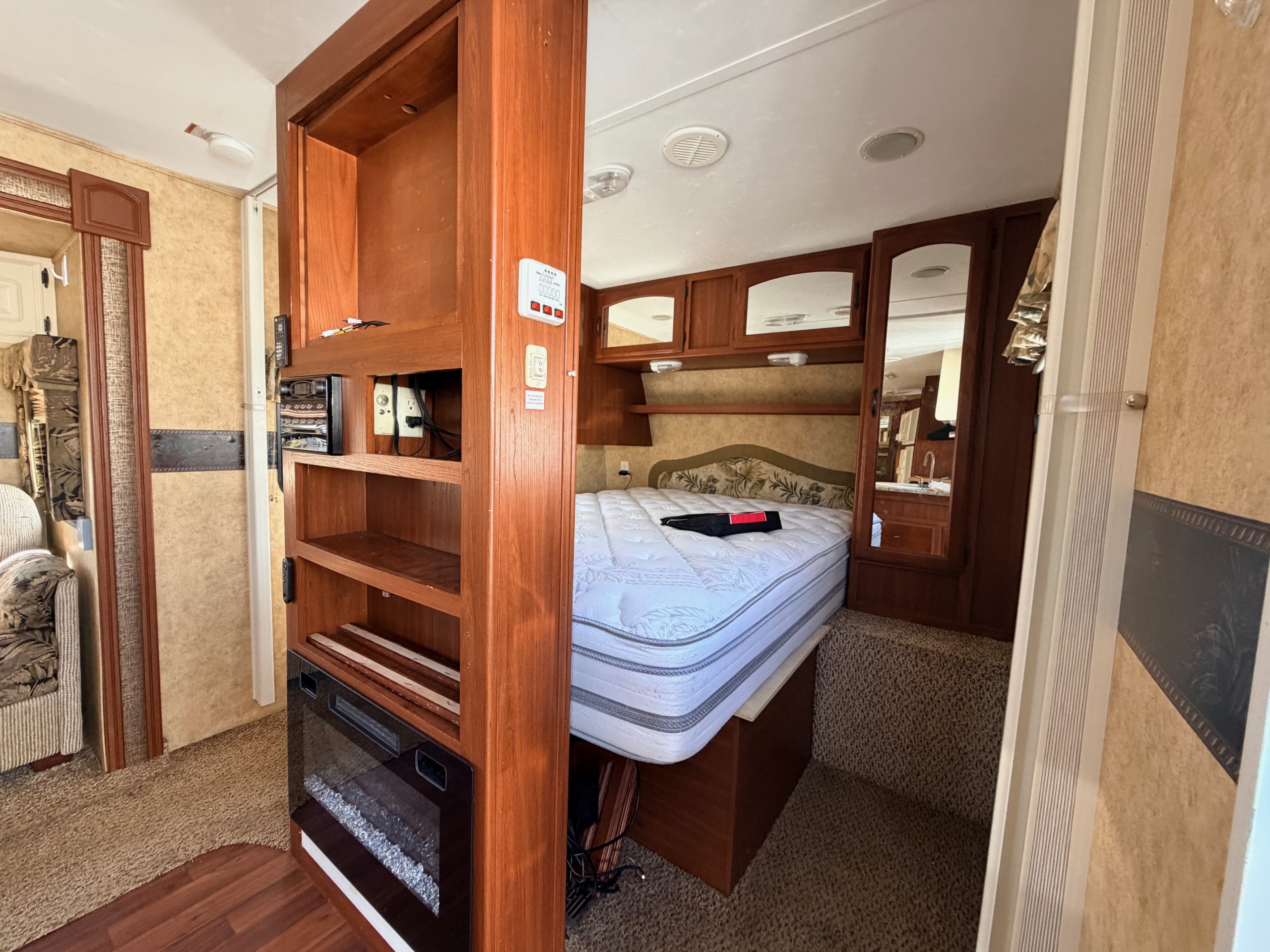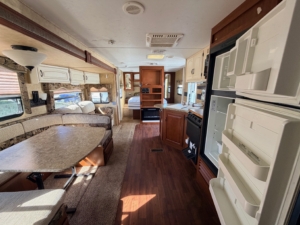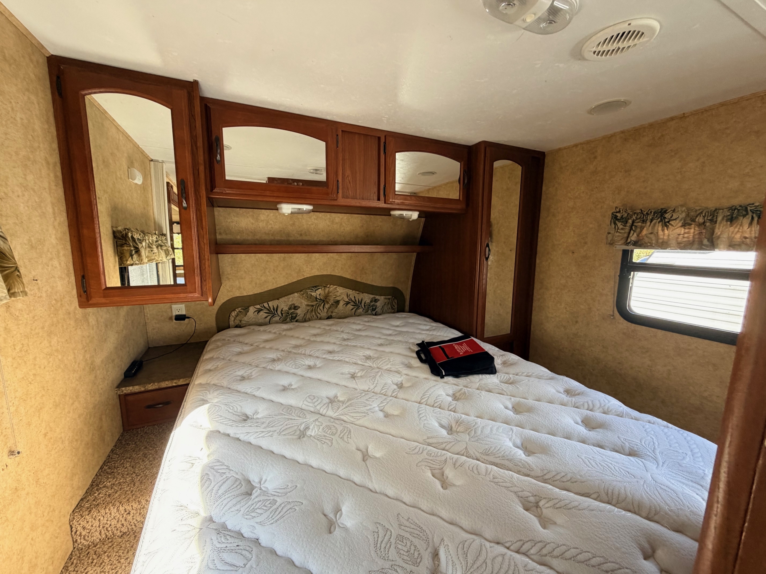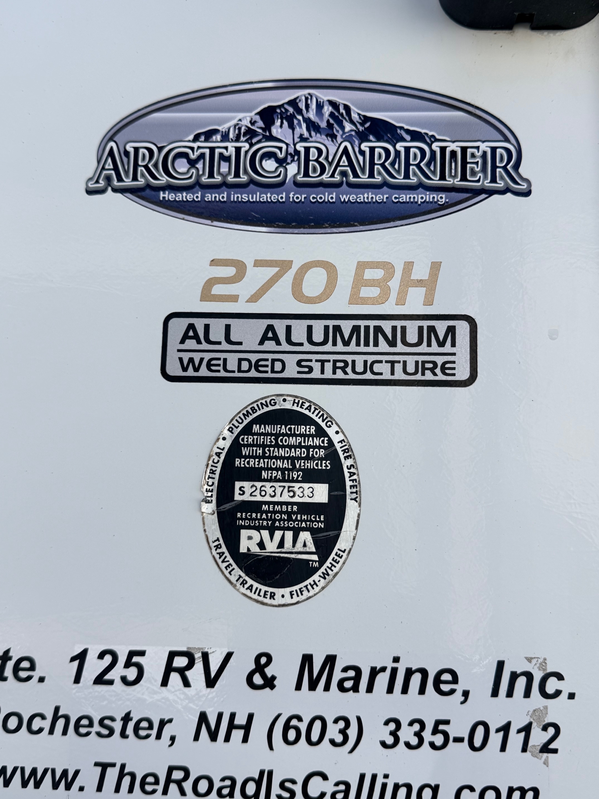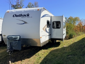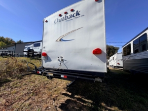 The 2011 Keystone Outback 270BH is a travel trailer measuring approximately 30.33 feet in length, with a dry weight of 5,944 lbs, a 16-foot power awning, and 1 slide-out. It can sleep up to 8 people, has holding tanks for 43 gallons of fresh water, 60 gallons of gray water, and 30 gallons of black water, and features a 13,500 BTU air conditioner and a 30,000 BTU heater.