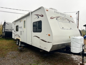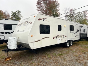 The 2011 Sunny Brook Harmony M-26FBS is a 27.58-foot travel trailer with a dry weight of 4,540 lbs and a GVWR of 5,500 lbs, featuring one slideout, a 14-foot awning, and a capacity to sleep up to 7 people. It has a front manual/rear manual leveling system, a 13,500 BTU air conditioner (optional), and a 20,000 BTU heater. Water capacities include 43 gallons for fresh water, 33 gallons for gray water, and 25 gallons for black water, with a 6-gallon water heater.