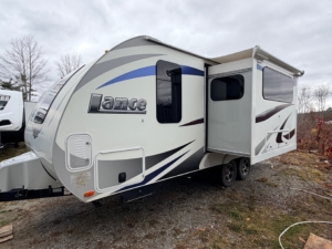 The 2019 Lance 1985 travel trailer has a dry weight of approximately 4,2454lbs, an overall length of23′3′′23 prime and can sleep up to four people. Key features include a single slide-out, a U-shaped dinette, a full-width rear bath, and an aluminum-framed construction. Standard capacities include 45 gallons each for fresh, gray, and black water tanks.