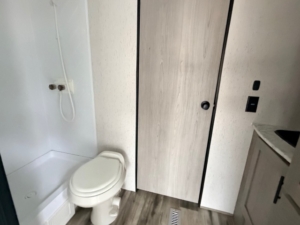 The 2023 Coleman 300TQ is a toy hauler travel trailer with a length of 34′ 11″, a dry weight of approximately 6,878 lbs, and a maximum sleeping capacity of 8. Key features include a single slide-out, a U-shaped dinette, a 13,500 BTU air conditioner, a power awning, and a ramp door for vehicle access. The holding tanks include 60 gallons for fresh water, 42 gallons for gray water, and 42 gallons for black water.