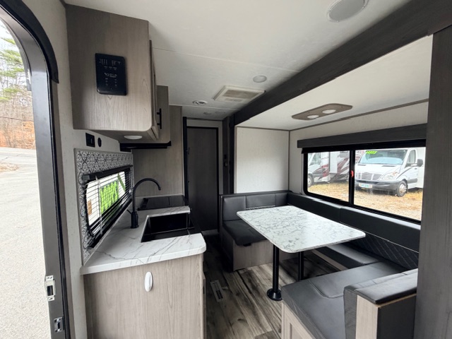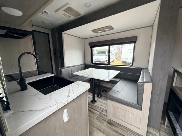 - Living Area: U-shaped dinette, optional fireplace